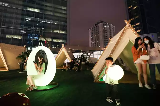 are many camping tents scattered on the grass, attracting many parents to play here with their children, and taking pictures here is full of vacation style.