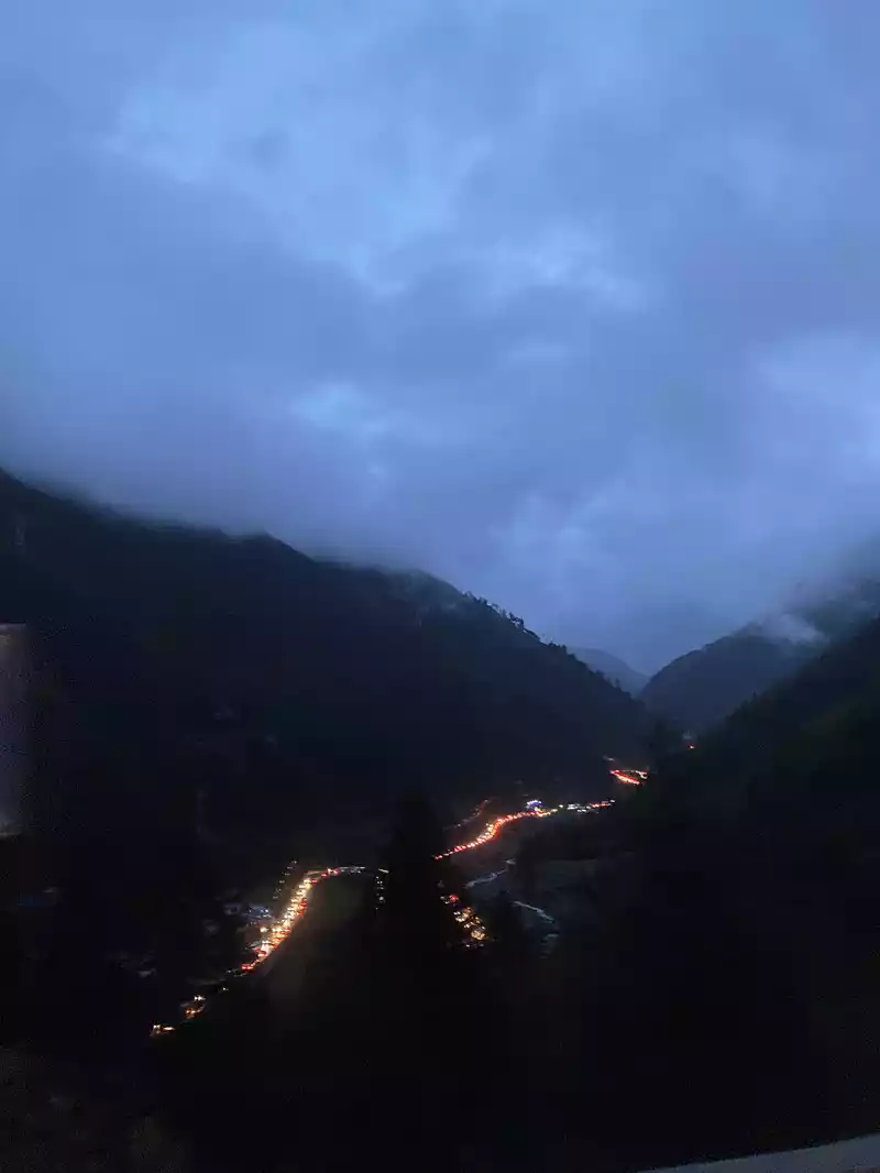 All the way back, the traffic jam began at the eighteenth bend of the heavenly road, according to the tour guide, it was a limited time to release the road every day, and it was common to block for 5 or 6 hours, and it was not open until about 8 o'clock in the evening, the day began to rain, and the face of the weather doll in the mountains changed, because the rain was still open 1 hour earlier than usual, slowly passing, the lights flashed in the black mountain hollow, like a winding light strip spreading in the mountains, and it was also a rare scenery that became our unexpected gain.