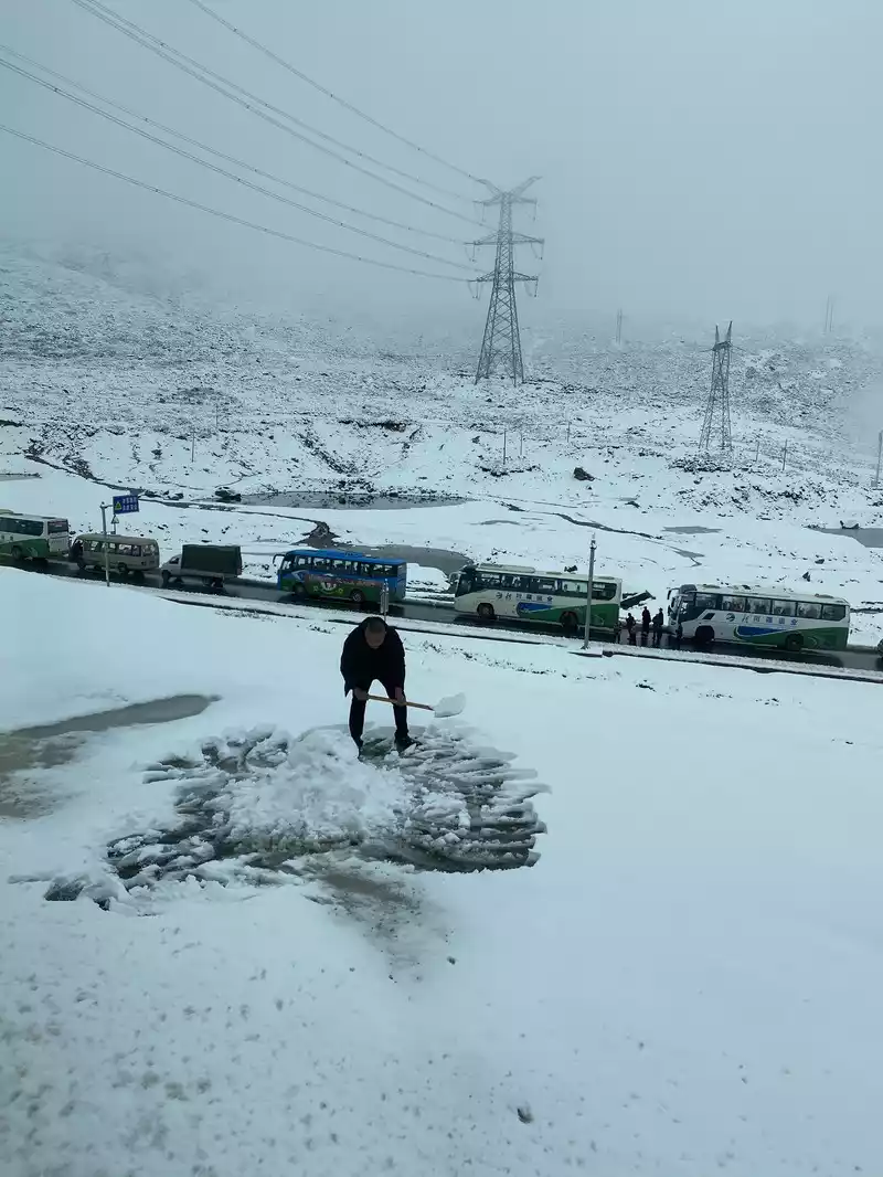 For safety reasons, the road here is restricted, and you must leave the Xindu Bridge before 7 a.m., otherwise the crossing will not be open until 2 p.m. We were like ducks, and after eating a mouthful of porridge in a hurry, the driver took us on our way, and rushed out of the Xindu Bridge crossing at 7 o'clock, and we had to praise the tour guide and the driver's arrangement. Due to a heavy snowfall last night, a thick layer of snow accumulated on the mountain, which put pressure on traffic, and another car queue slowly crawled in the snow, a piece of white snow, and the rare snow scenery added color to this trip. The return trip was originally scheduled to stop at the first pass of Kangba - [Zheduo Mountain] observation deck, but the snow was too thick and the observation deck was blocked due to safety.