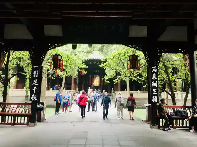 The gate of the Wuhou Temple begins, along the main axis of the three courtyards: there is a stele pavilion on the left and right of the front yard, the Tang stele on the right is the most famous, and its articles, calligraphy, and carving skills are top-notch, so it is called the "Three Absolute Monuments". The main courtyard is the largest, according to the court style for Liu Bei and the civil and military ministers built a group of statues, Three Kingdoms fans can find their favorite Shu Han heroes from it, and the walls on both sides of the door are engraved with the Southern Song Dynasty Yue Fei's crazy grass "Former Master Table" and "Rear Master Table", which is worth seeing. Behind Liu Bei's Hall is the Wuhou Shrine, the terrain is slightly lower, and you have to go down a few steps, which means "the king is high and the minister is low". The most famous here is the couplet written by Zhao Fan, a native of Yunnan in the Guangxu period of the Qing Dynasty: "If you can attack the heart, you will turn around and eliminate yourself, and you will know that soldiers are not belligerent from ancient times; If you don't judge the situation, you will be wrong to be lenient and strict, and you will think deeply about the governance of Shu later." It is rumored that this is a must-see for the frontier officials who came to Sichuan.