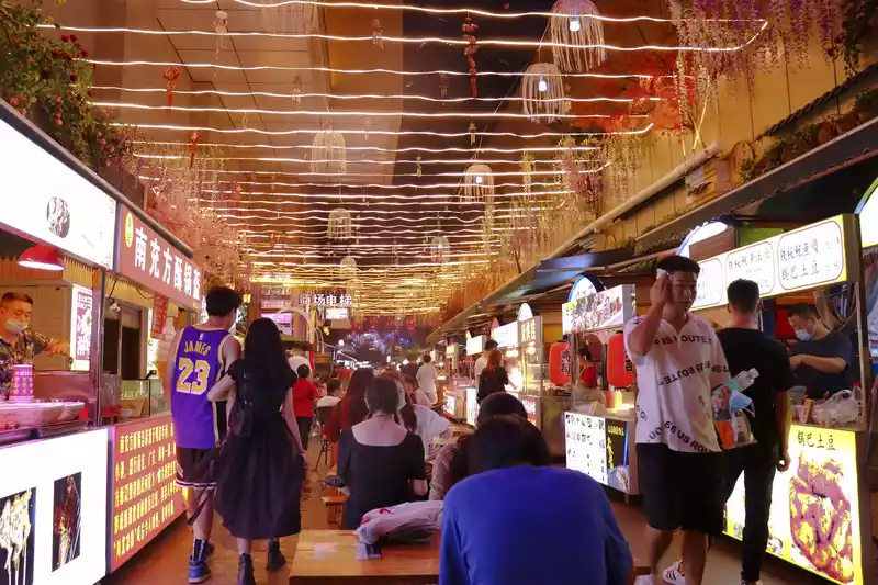 are not many snacks in the night market, but there are several food streets around that are enough for you to enjoy a good meal: Summer Socks South Street, Yanshi Street, and Underground Food City (Chunxi Road Metro Station Exit).