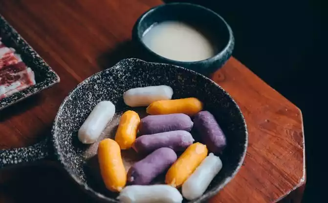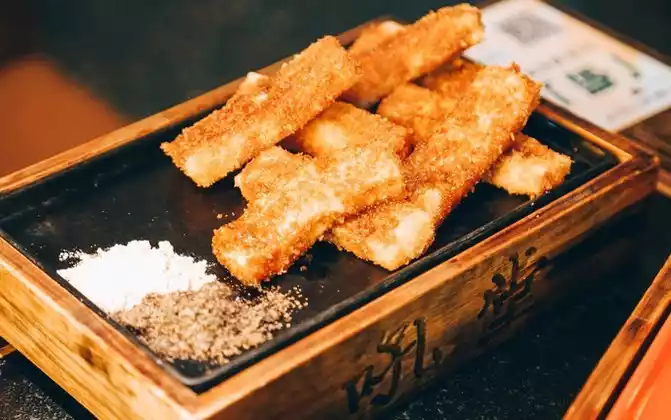 Egg crisp glutinous rice cake, coated with a layer of egg liquid and then fried, soft and glutinous, dipped in dry dipping sauce to eat, sweet and very relieved of the spiciness of hot pot.