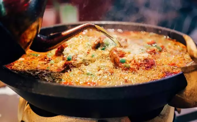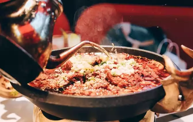 The hot oil stimulates the aroma of garlic and beef, and the hot smoke rises instantly, and there are dense bubbles, which makes people feel appetizing when they look at it.