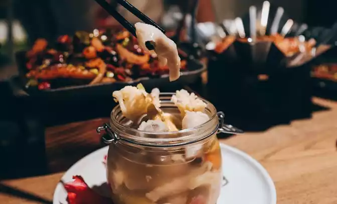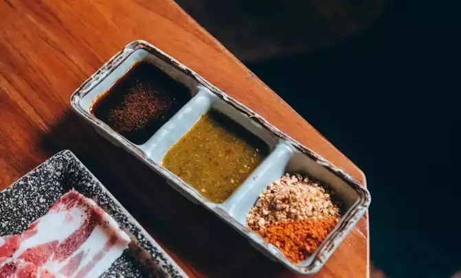 There are 3 types of dipping sauces, the middle one is very characteristic and a bit Thai hot and sour, and the left and right sides are traditional Sichuan dry dishes and Japanese teriyaki sauce dipping sauce.