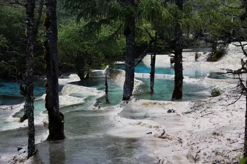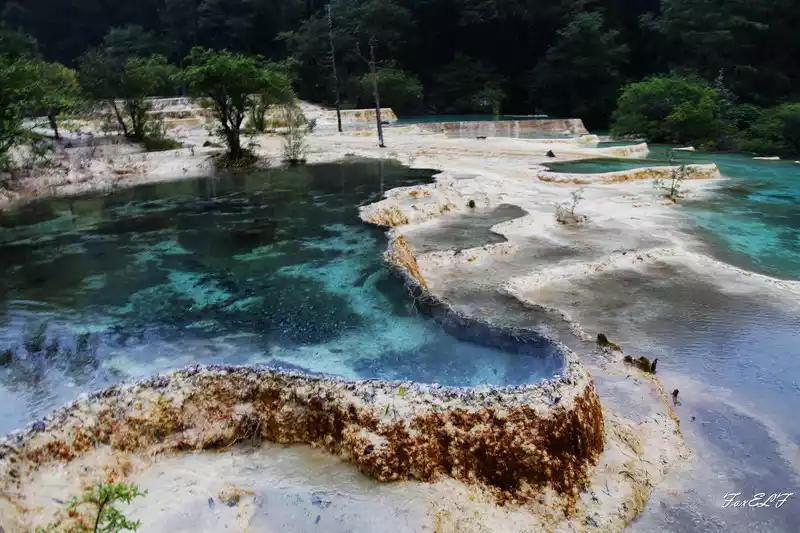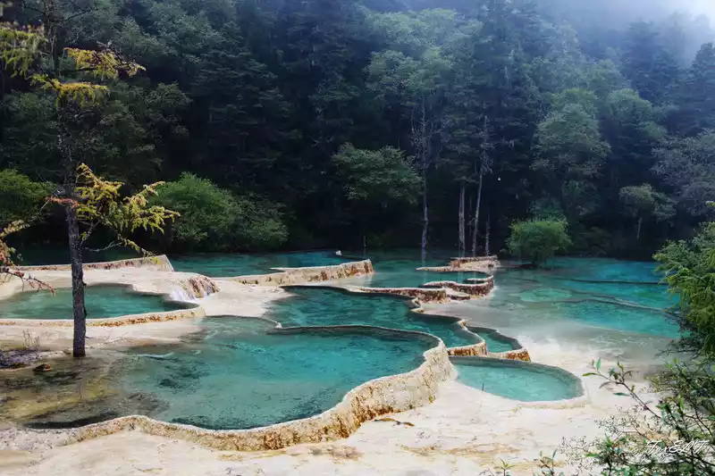 The colorful pool is 3,576 meters above sea level, with an area of 21,000 square meters and 693 color pools, which is the largest group of color pools in Huanglonggou, and it is also the largest and highest open-air travertine pool group in the world today. The colorful pond embankment is low, staggered, the pool water is overflowing, and from a distance, the colorful pond looks like pieces of green jade plates, under the sunlight, white, purple, blue, green, different shades, colorful, extremely beautiful and delicate. In the middle of winter, under the reflection of jade trees and jade flowers, the color pool is still blue and jade, treacherous and fantastic. The pond and dam have different shapes, including arc-shaped, fan-shaped, skirt-shaped, etc., arranged in a staggered manner, layered on top of each other, just like a three-dimensional oil painting of "Yaochi in the world", born with a "holy land wonderland" without romance. The pool water becomes colorful with the sediment of the water, the color of the dam, the refraction of light, and the depth of the pool. Due to various changes in light irradiation, a colorful "colorful scene" with the same origin of the pool water is formed, which has become a beautiful landscape in Huanglong Scenic Area.