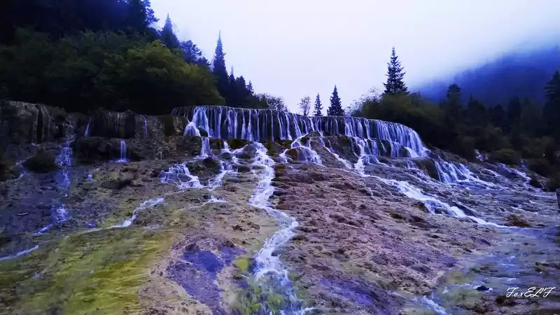 Pearl Beach Waterfall, 2,445 meters above sea level, 21 meters high and 162 meters wide, is a typical combined landscape in Jiuzhaigou, and is the place where Tang monks and apprentices wade through the water at the beginning of the TV series "Journey to the West". The Pearl Beach Waterfall, like the Milky Way falling from the sky, is majestic, emitting an earth-shattering roar in the valley, which is extraordinary. The wide waterfall rushed into the bottom of the valley, roaring like thunder, rolling out thousands of waves, surging water mist in the emerald valley, and then rushing eastward, the sound of water thundered, the mountain stream boiled, and the momentum was majestic.