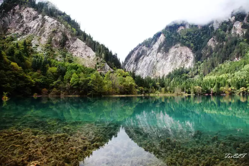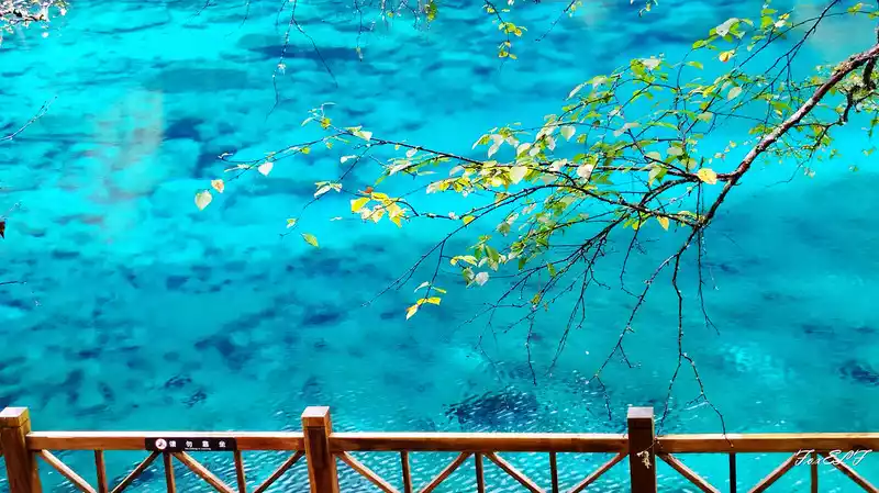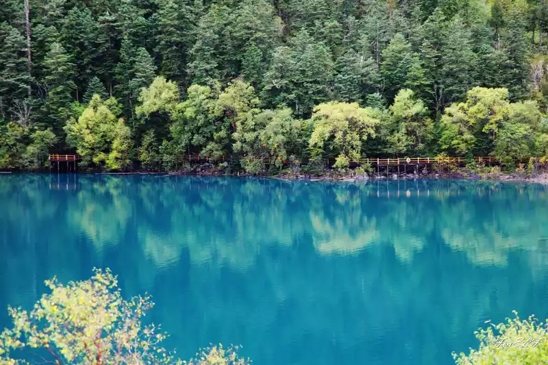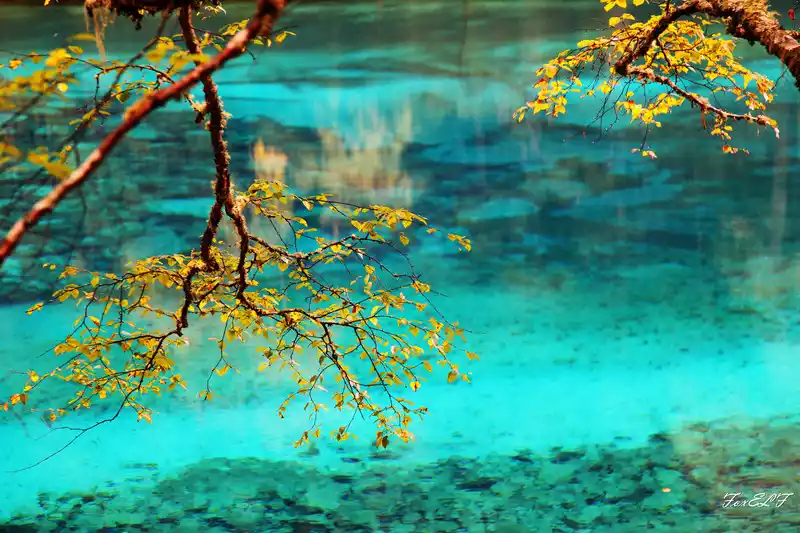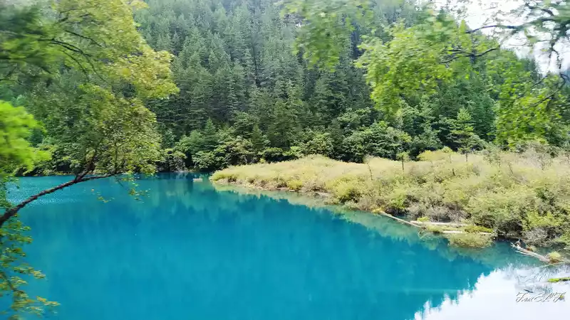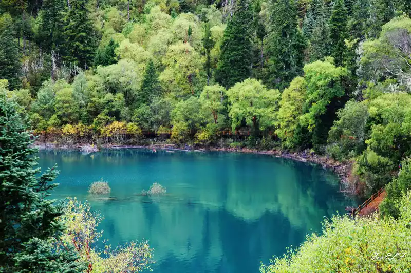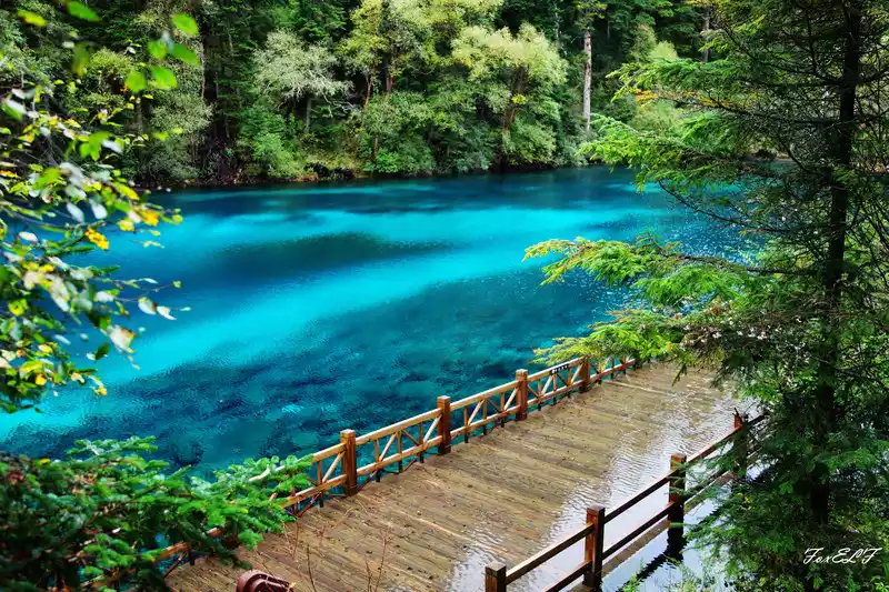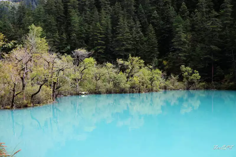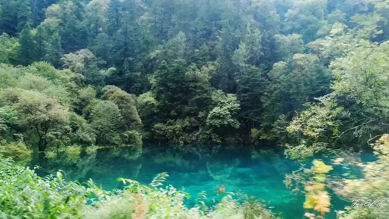 Colorful pool. 1 kilometer down from Changhai is the Wucai Pond, which is 2,995 meters above sea level and 6.6 meters deep, hidden in the deep valley under the highway. Although the colorful pond is the least exquisite among the seas of Jiuzhaigou, its colors are the most colorful, comparable to the sea of five flowers. The colorful pond is extremely clear, through the pool water, you can see the stone patterns on the rock surface at the bottom of the pool, due to the color difference of the sediment at the bottom of the pool and the different colors of the plants on the poolside, the originally blue lake surface becomes colorful. It is the essence of Jiuzhaigou Lake and the most exquisite sea, known as the Eye of Jiuzhai.