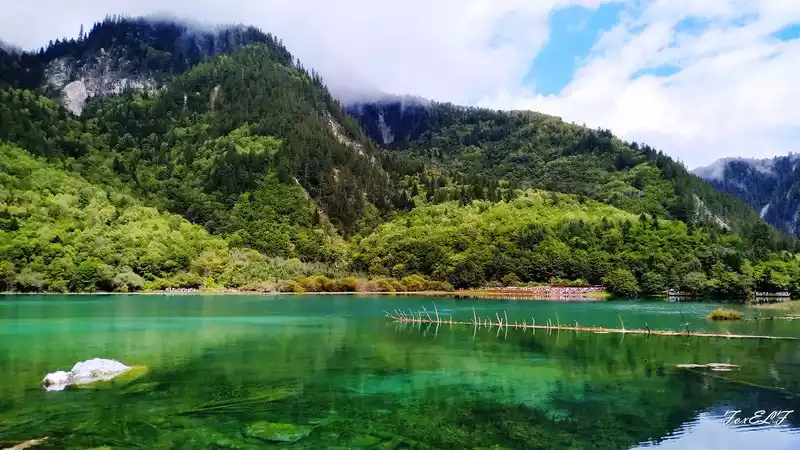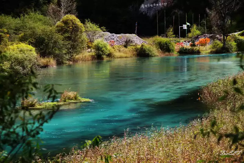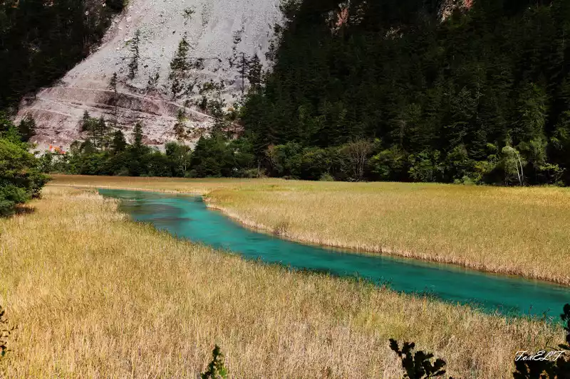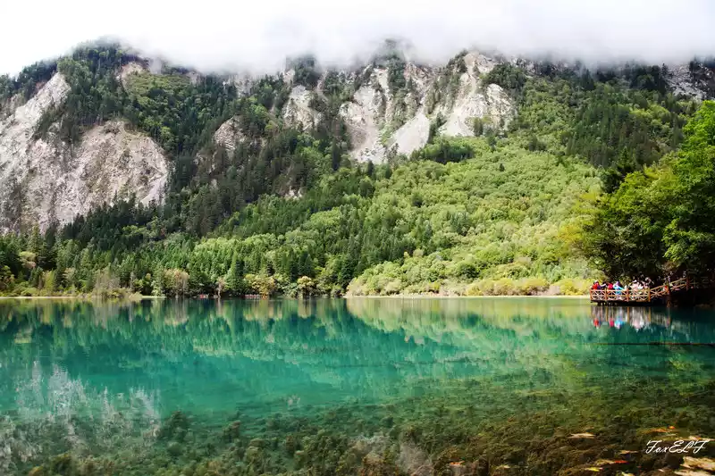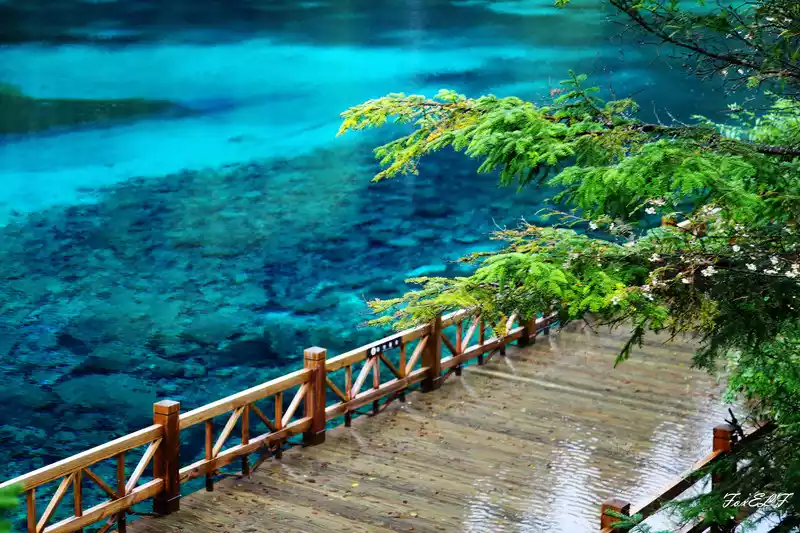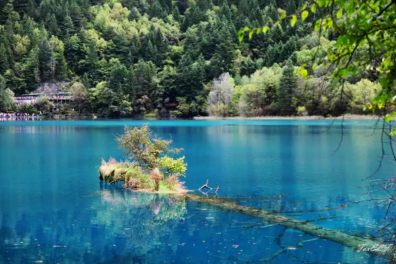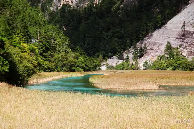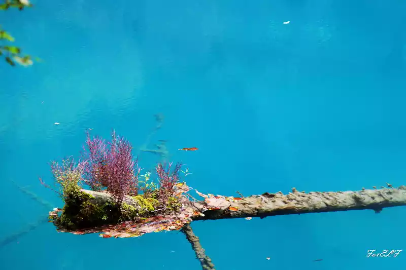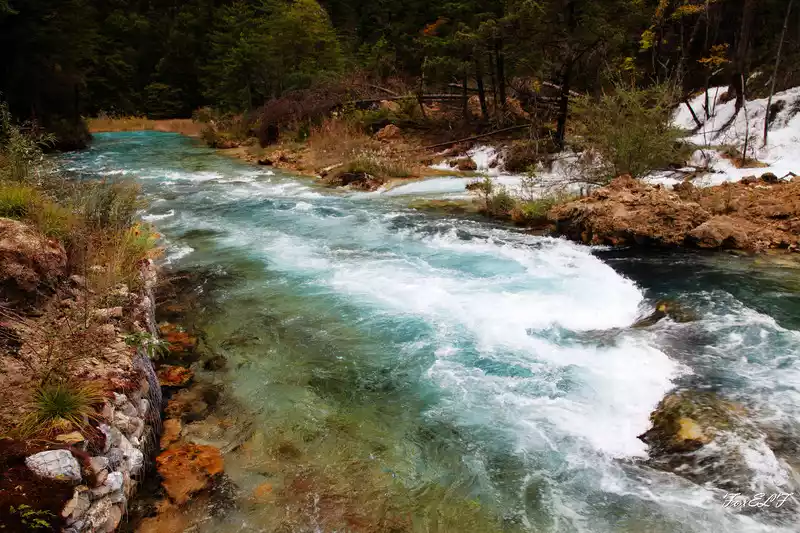 Colorful pool. 1 kilometer down from Changhai is the Wucai Pond, which is 2,995 meters above sea level and 6.6 meters deep, hidden in the deep valley under the highway. Although the colorful pond is the least exquisite among the seas of Jiuzhaigou, its colors are the most colorful, comparable to the sea of five flowers. The colorful pond is extremely clear, through the pool water, you can see the stone patterns on the rock surface at the bottom of the pool, due to the color difference of the sediment at the bottom of the pool and the different colors of the plants on the poolside, the originally blue lake surface becomes colorful. It is the essence of Jiuzhaigou Lake and the most exquisite sea, known as the Eye of Jiuzhai.