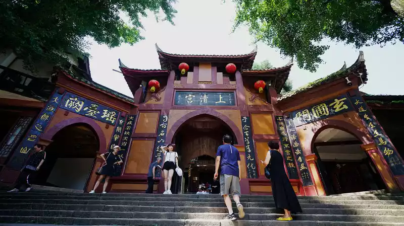 Shangqing Palace is located on the first peak of Qingcheng Mountain, about 500 meters away from the peak, on the half slope, built in the Jin Dynasty, the existing temple was built during the Tongzhi period of the Qing Dynasty, with cliff carvings such as "the fifth famous mountain in the world" and "the first peak of Qingcheng", and the three characters "Shangqing Palace" at the palace gate were inscribed by Chiang Kai-shek. The palace enshrines Li Laojun, the ancestor of Taoism, with a statue of Lao Tzu and a 5,000-word woodcut of the Tao Te Ching, as well as legendary relics such as Magu Pond and Mandarin Duck Well...... Behind the Shangqing Palace is the old sky, with an echo pavilion, which is an excellent place to enjoy the sunrise, magic lanterns and the wonders of the sea of clouds.