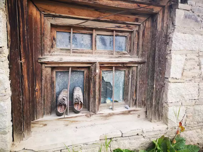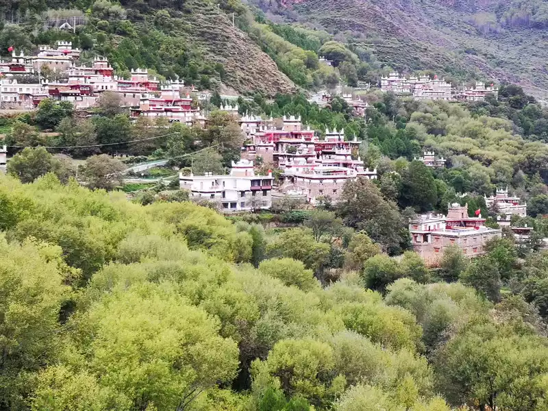"Jiaju" means a hundred households in Tibetan, and the village is as the name suggests, on the hillside with a relative height difference of nearly a kilometer, Tibetan-style buildings are scattered among the green trees, dotted with smoke and clusters of peach blossoms, which looks quiet and chic. The village generally has one floor for each household, and the village building sits north and faces south, all of which are wood and stone structures. The wooden frame and eaves are red, and the walls are painted white or the primary color is mixed with white. Every year on the eve of the Spring Festival, the masters will carefully paint the walls of the village building according to traditional customs and use the local "white mud" as the main raw material, so that the entire Tibetan village is dressed in white costumes.