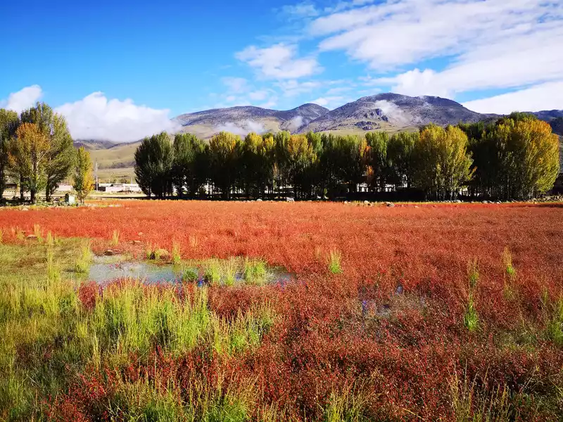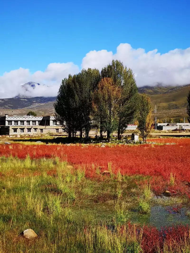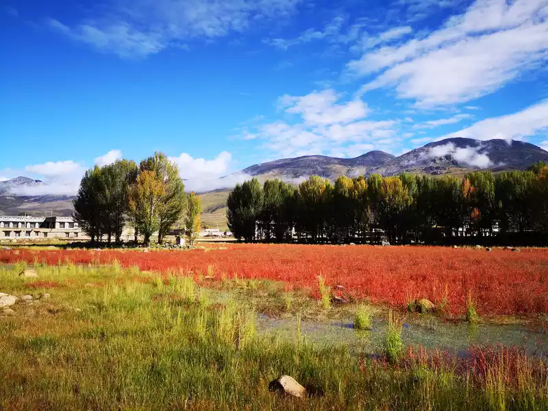 Sangdui Township is located in the north of Daocheng County, 28 kilometers away from the county seat. Sangdui is a typical Tibetan village with beautiful scenery. The most famous is the dazzling red grass beach, where many people stop just to take pictures of the red and refreshing red grass beach. There is a wetland the size of a football field on the edge of the village, and at the end of September and the beginning of October every year, clusters of aquatic plants are like being ignited, red like fire, attracting countless pedestrians on the Sichuan-Tibet line, which is the famous red grass beach, which makes the small mulberry pile receive great attention.