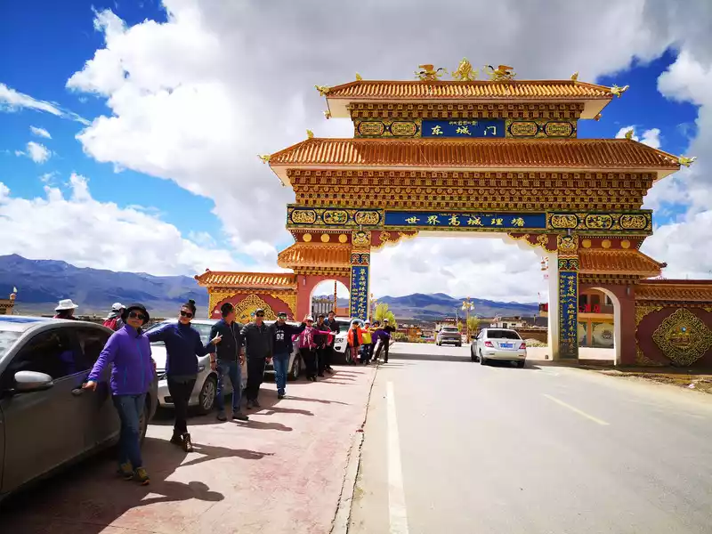 Let's take a group photo with people and cars at the gate of Litang, the world's high city