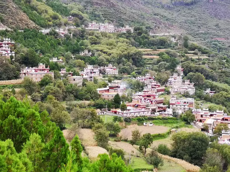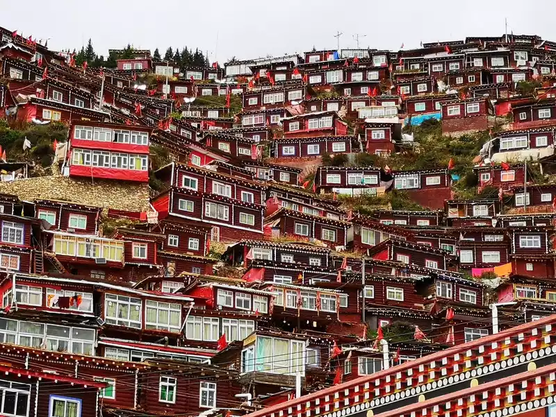 Sedara Rong Wuming Buddhist College is located about 20 kilometers southeast of the county seat of Seda County, surrounded by mountains. Centered on the Great Sutra Hall of the Buddhist Academy, thousands of log cabins are densely packed like ant nests on the hillside, and a large number of crimson log cabins stretch and undulate, which is spectacular.