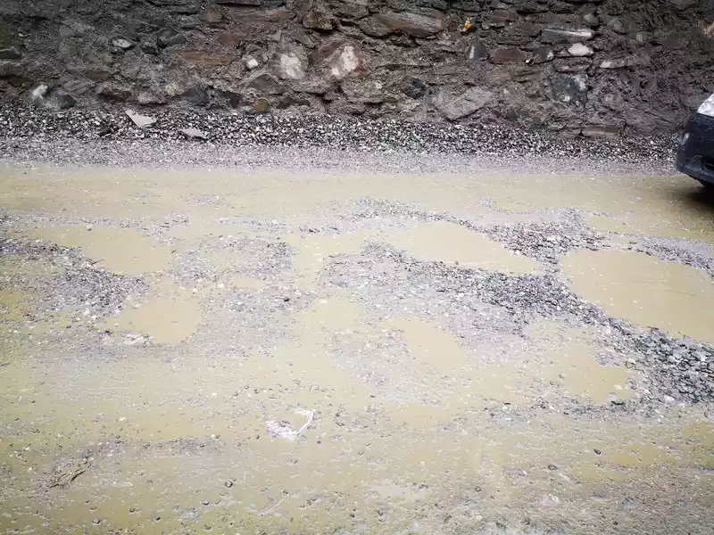 Roads like this are not the worst, some road sections are deeper than this, the car can only drive to a speed of 5-10 kilometers per hour, slowly ride on the higher stones with tires, the chassis of the car often makes the sound of colliding with stones or gravel roads, at this time you can't hurt the car, safety used to be more important than anything else, and some sections of the road landslide, can only be passed by bicycles, the object of the car is a very troublesome thing, fortunately, this road is difficult to walk but there are very few cars, while walking I observe the surroundings, the most important thing to pay attention to is the falling rocks on the mountain, When encountering dangerous road sections, hurry up and pass, you can't stay to prevent accidents, but also pay attention to the road conditions, I drive over the landslide section or where there is water first, and then notify the cars behind me to pass, occasionally a few cars come over, all SUVs or off-road vehicles, see us roll down the window and stretch out our thumb, and shout "Come on, buddy" to us. We took the opportunity to ask them about the driving conditions and approximate driving time ahead, so that we could have a good understanding of what they were doing.