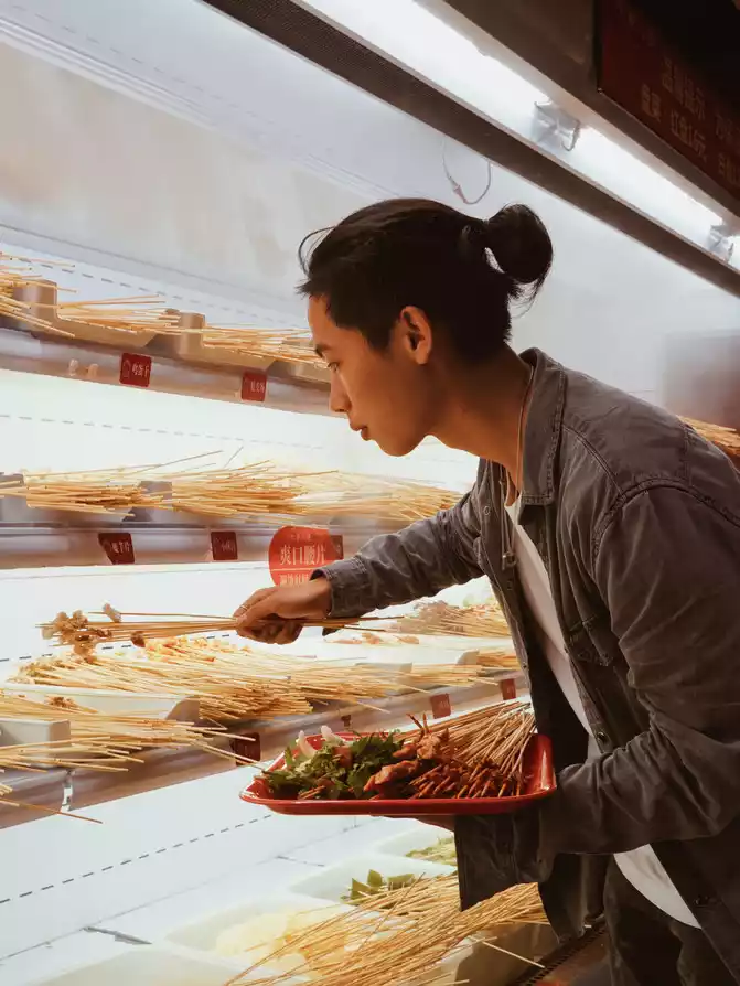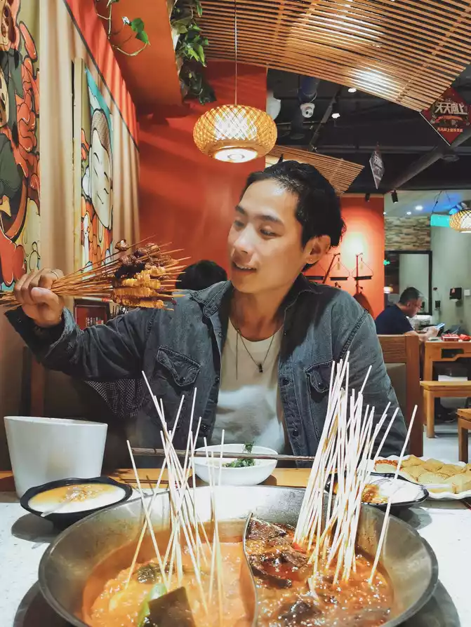 Chengdu's slightly hot skewer shop, the decoration is very Sichuan-Chongqing characteristics, it just so happens that today's clothes and lighting are very matched, take some photos.