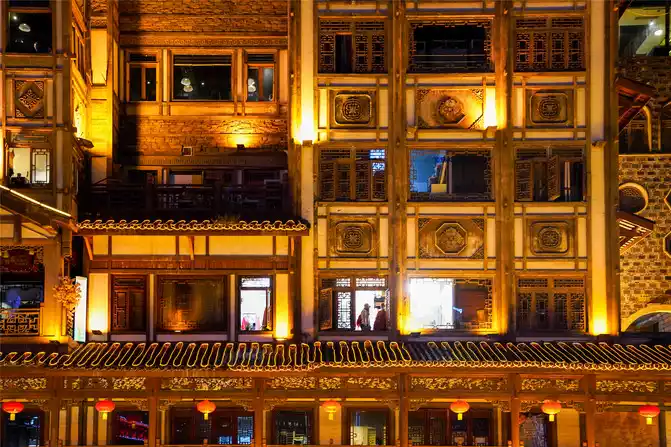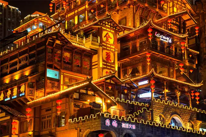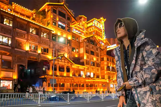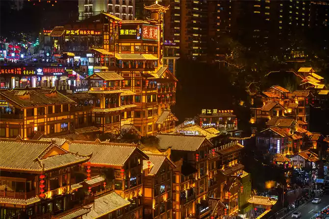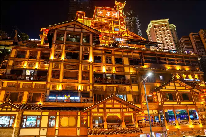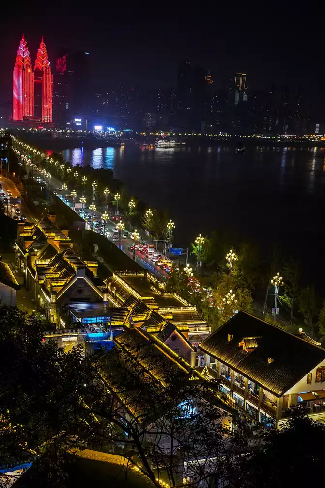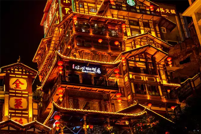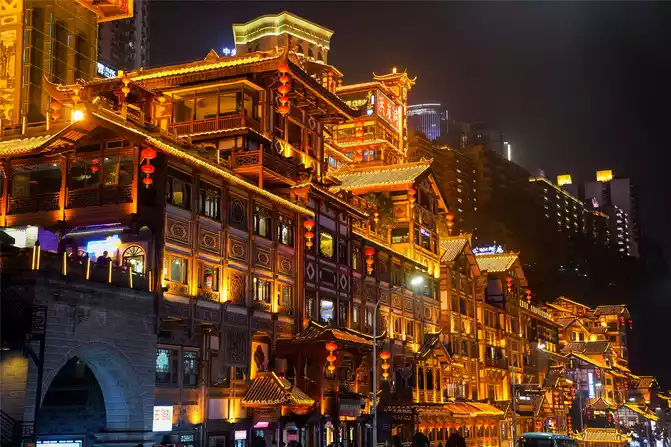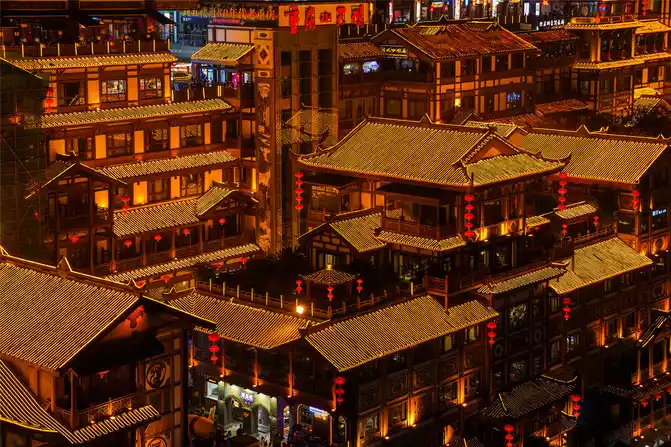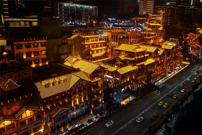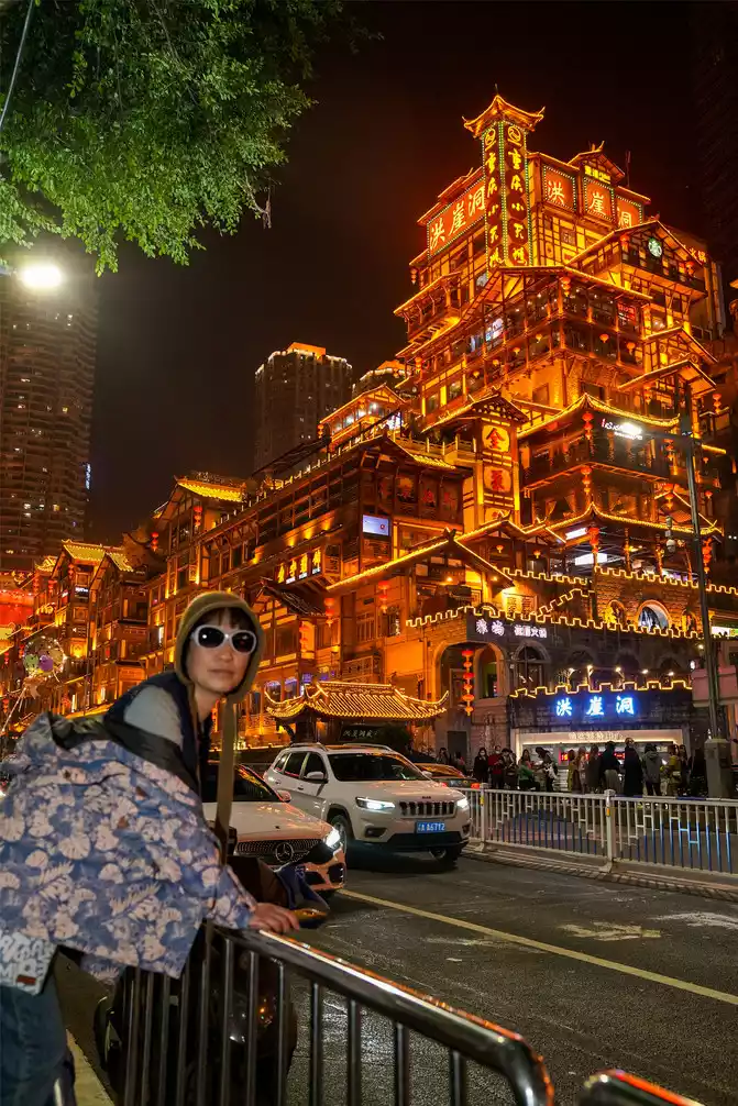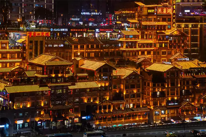 [Hongya Cave] is one of the must-check landmarks in Chongqing.And every holiday, Hongya Cave is a well-deserved traffic celebrity. Hongya Cave, formerly known as Hongya Gate, is one of the ancient Chongqing city gates, on the basis of the original site, Hongya Cave takes the stilt building with the most traditional architectural characteristics of Bayu as the main body, is built along the mountain, is a unique "three-dimensional air pedestrian street". In just a few floors, it brings together six major industries such as catering, entertainment, leisure, and characteristic cultural shopping, which are brightly lit up for a while and have unlimited scenery, becoming the most layered and textured urban scenic spot commercial center. Hongya Cave at night has the most well-known side, when its lights turn on in an instant, it is like pouring layers of golden paint, like a dreamy feeling of Spirited Away, like traveling to a two-dimensional space in minutes. This is a scene shot on the ground. Photo output index: ★★★★★