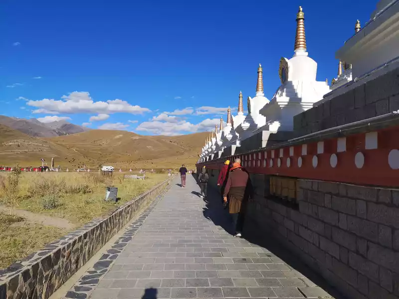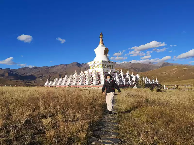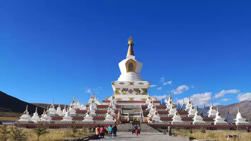 The white pagoda is divided into 3 parts, the spire, the tower body, the tower base, the pedestal is placed with rows of prayer wheels for Tibetans to worship devoutly, the pagoda identity is 3 parts, and a bodhisattva is enshrined on the top. Because the tower is white, it is named White Pagoda.