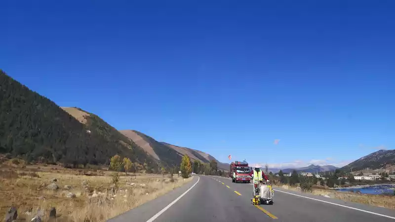 National Highway 549: Paved asphalted road, road builders are doing the final process: drawing lines