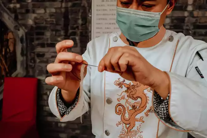 demonstrated the knife skills of Sichuan cuisine on the spot, and watched a master blindfold the dough with a kitchen knife weighing several pounds blindfolded and cut the dough into threads that could be threaded, it was awesome!