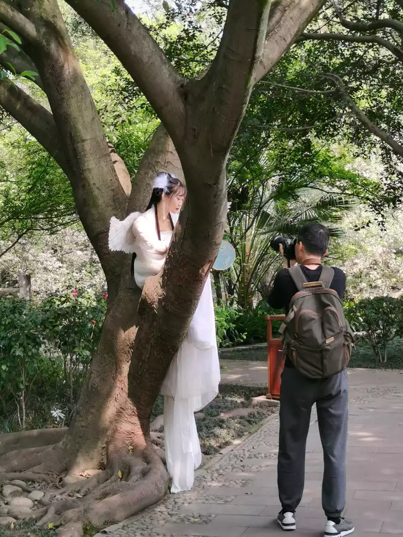 There are two roads further on, the Jinhua Bridge on the right leads to the east bank, and the Chunpo Bridge on the left leads to the island protruding from the lake, and you can see the Moon Tower on both sides. This is two cameramen taking pictures of a beautiful woman on the platform of the Moon Tower across the lake.
