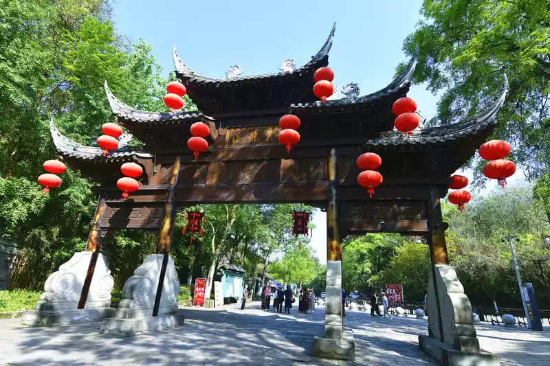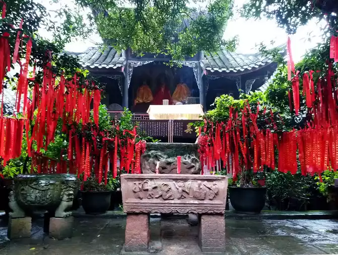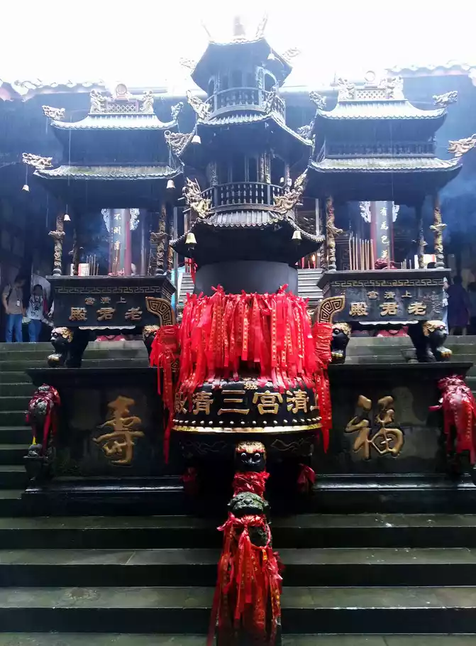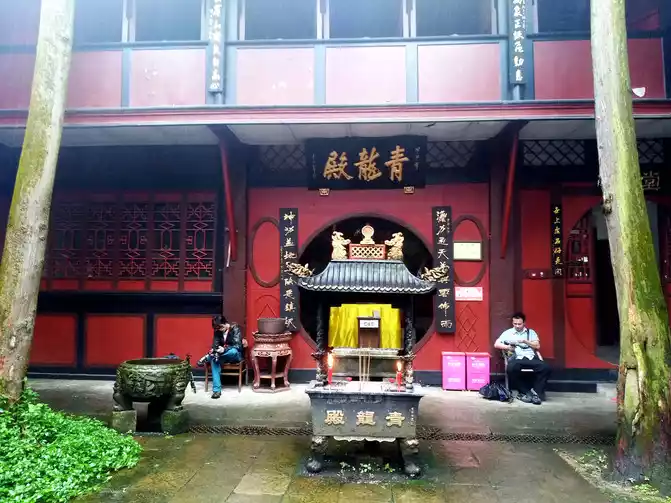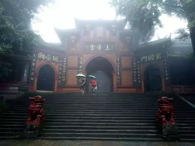 Jianfu Palace was built during the Kaiyuan period of the Tang Dynasty, formerly known as Zhangren Cave, which is said to be the place where Wang Yue's father-in-law Ning Fengzi practiced Taoism, and Ningfeng was the main immortal of Qingcheng Mountain. A pavilion is built in front of Jianfu Palace, and there is a red terrace and green forest behind. The palace is resplendent, the courtyard is fresh and elegant, with rockeries, embellished with pavilions, like a fairy palace. The front hall is called the "Hall of Eternal Life", and the main hall is a statue of Ningfeng. There are three statues in the apse, with the Supreme Laojun in the middle, who is revered as the leader of Taoism.