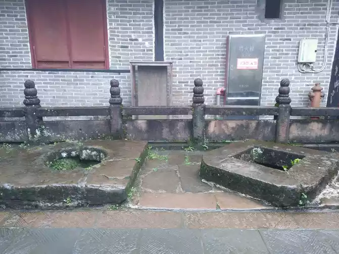 are two wells side by side in front of the south building on the right side of the > Hall, called the Mandarin Duck Eight Sealing Well. Two wells - square and one round, their sources are connected, but one is muddy and one clear, one shallow and one deep, and the well is engraved with the three words "Mandarin Duck Well" written by the Chinese painting master Zhang Daqian.