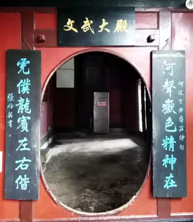 is dedicated to Wensheng Confucius and Wusheng Guan Yu. Inside are Zhang Daqian's portraits of the Queen Mother, Magu, Patriarch Sanfeng and Lady Huarui. On the ceiling, there are ink dragons, twenty-four filial piety pictures and paintings on the theme of the story of the Three Kingdoms.