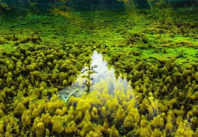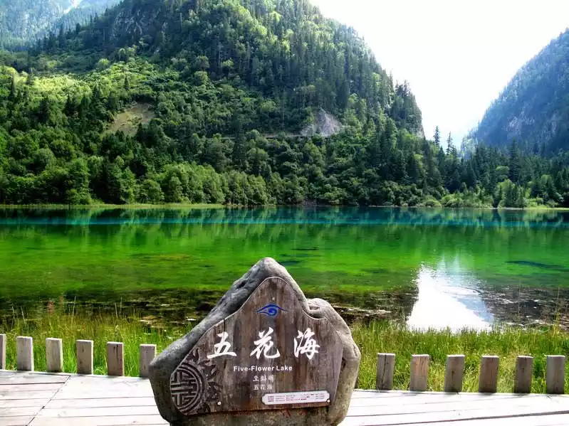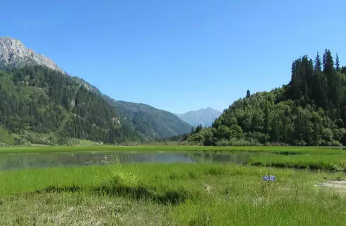In late autumn, the colorful forests on the mountain reflect the lake, with travertine deposits, gorgeous algae, and submerged plants at the bottom of the lake, at this time the colorful color blocks in the sea are like giant ornaments inlaid with countless gemstones, a magnificent picture that even the most famous painters cannot depict. Although there is sunshine in midsummer, the sea of flowers still has a lot less color, just like a beauty in plain clothes, although beautiful but difficult to win people's souls.The best thing to see the whole picture of the sea of pork flowers is the "tiger's mouth", but unfortunately I couldn't find the way, which is a big regret of this trip
