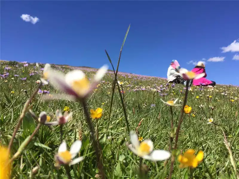 Coming out of the flower lake, it was still early, we went straight to the first bay of the Yellow River Jiuqu, if the itinerary just now only opened a corner of the grassland, next, our car drove into the hinterland of the grassland - the vast blue sky, the endless hills, the flower-tudded grassland, and the black (yak) and white (sheep) dotted on the green carpet rushed uncontrollably, leaving you stunned, at a loss, all the hustle and bustle, grievances and grievances left you, It seems that there are only three of us left in the world, my eyes are in heaven, and my soul has returned to my hometown!