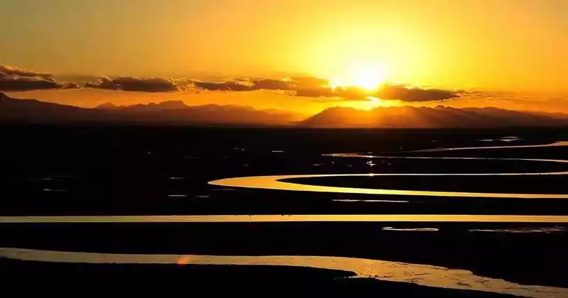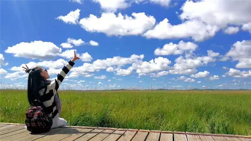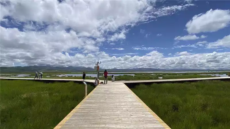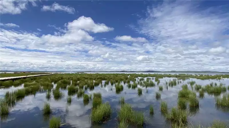 Flower Lake is a swampy lake in the Gers Dam grassland, named after the beautiful small flowers that bloom in the shallow water every summer. Green accompanies the lake, with the long plank road, the large sky, and the clouds entangled between the water and the sky, although simple, but it makes people fall in love at first sight.