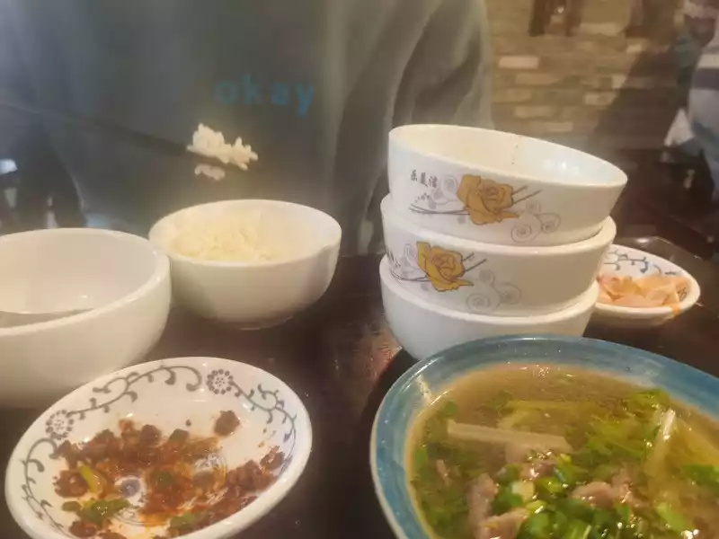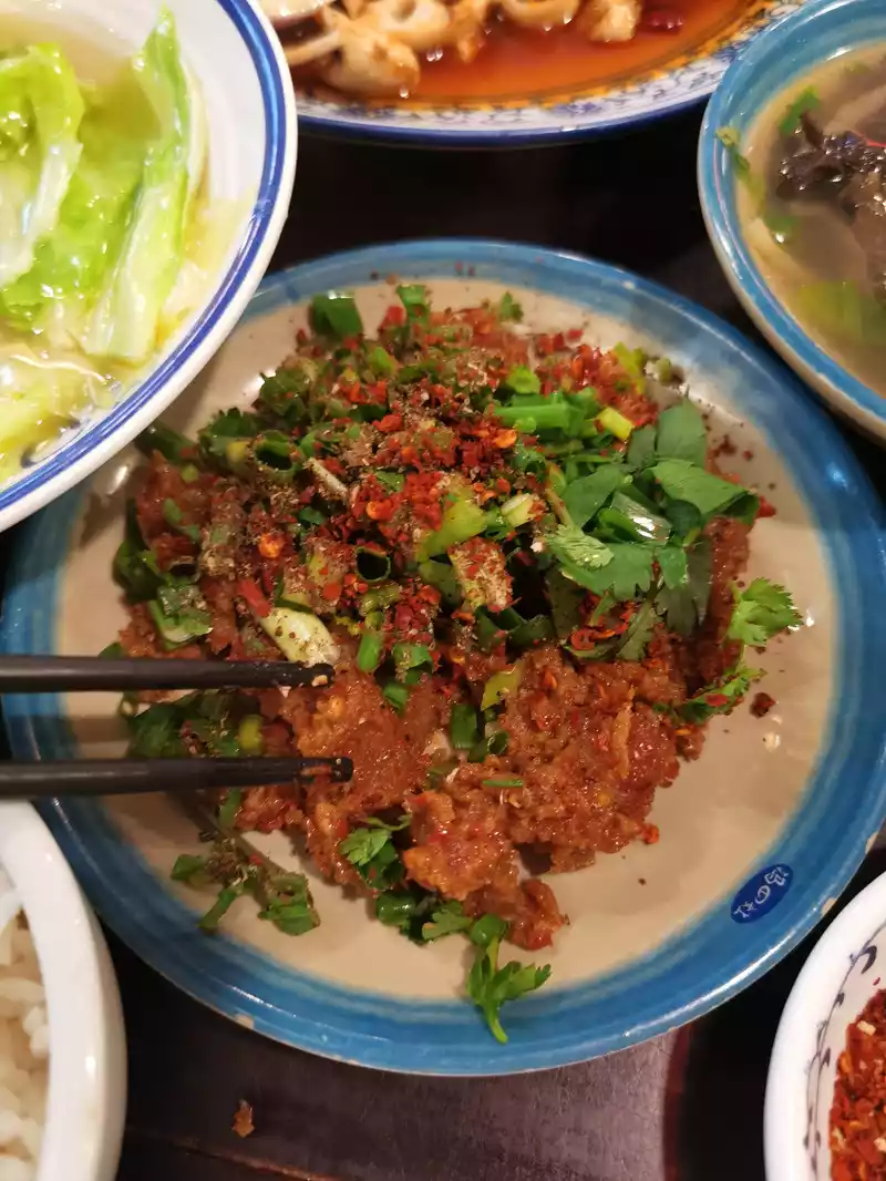 Beef: Local foodies in Leshan told me that the beef must be eaten in the first pot, and the soup is the original flavor. As soon as we got off the train, my colleagues and I went straight to Jiaxing Road, and the best beef "Feng Si Lady Beef" was on this street. As soon as people walked to the gate, they drooled, the secret soup was rolling in the steaming cauldron in the open file, and the chef skillfully scalded various dishes with a large colander.
