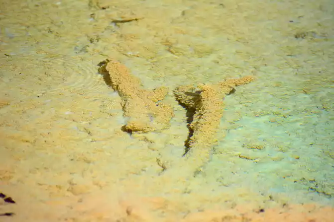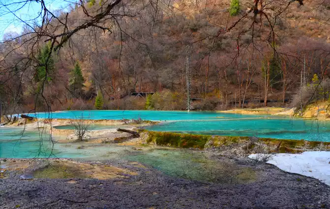 Qinglong Sea and Divine Frog Sea: Their shape is the same as the size of Jiuzhaigou, where the dead wood lies quietly at the bottom of the water, forming a natural picture, especially the clear water here can see the landscape of the "seabed", and even the form of the calcified sunken wood in it and the various algae plants on it are clearly visible.
