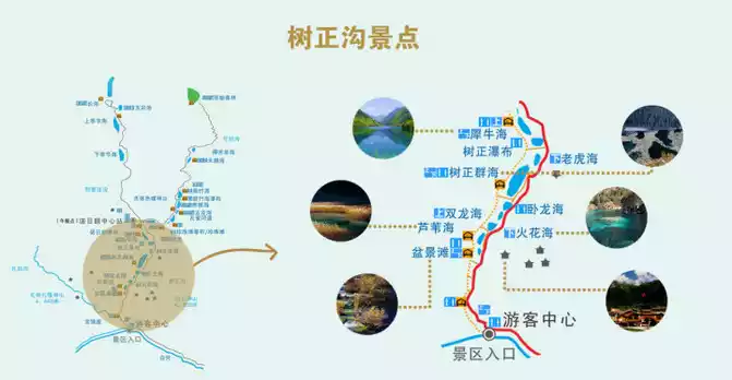 Below the "Y" shape is Shuzhenggou, and its main attractions include Rhino Sea, Tiger Sea, Shuzheng Waterfall, Shuzheng Mill, Shuzheng Village, Shuzheng Qun Sea, Wolong Sea, Flower Sea, Shuanglong Sea, Reed Sea and Bonsai Beach.
