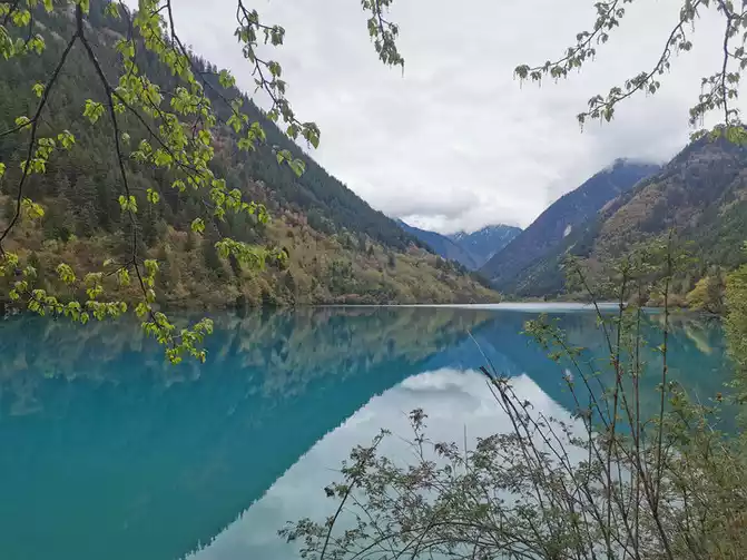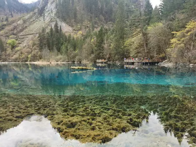 Thecolorful pond is extremely clear, through the pool water, you can see the stone patterns on the rock surface at the bottom of the pool, due to the color difference of the sediment at the bottom of the pool and the different colors of the plants on the poolside, the originally blue lake surface becomes colorful. It is the essence of Jiuzhaigou Lake and the most exquisite sea, known as the Eye of Jiuzhai. In May, the snow-capped mountains have not yet melted, and the water volume is insufficient, so the water level is shallow, which is a slight regret.