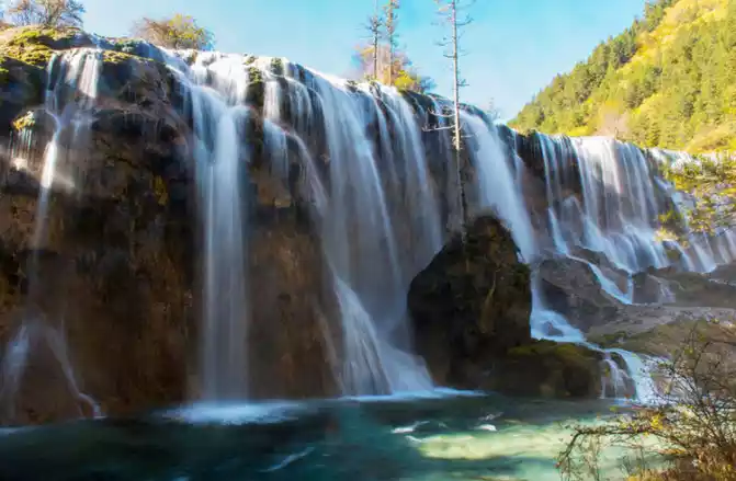 Beach Waterfall is 2445 meters above sea level, 21 meters high and 162 meters wide, It is a typical combined landscape in Jiuzhaigou, and it is the place where the Tang monk and his apprentice lead horses and wade through the water at the beginning of the TV series "Journey to the West".