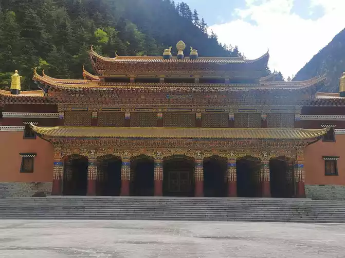 Zaru Temple is backed by a vein of Cangshan, facing the Treasure Mirror Cliff, with a golden top and red eaves, and five-colored prayer flags praying earnestly in the wind. It is the largest and most famous lama temple near Jiuzhaigou, and it is also a holy place for Bon believers.Known as "Ranwu Gompa" in Tibetan, it was built at the end of the Ming Dynasty and has undergone two renovations, with a strong Tibetan temple color. Zharu Monastery belongs to the "Yongzhong Main Religion", which is the Tathagata Dharma taught by the Buddha Xin Rao Miwo, and is also known as the oldest Xiangxiong Buddhism in Tibet.