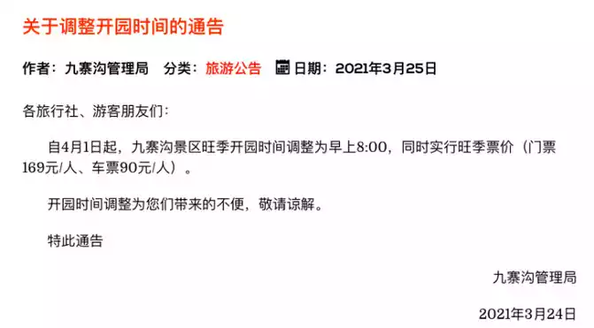 Jiuzhaigou implements two prices in the off-peak season throughout the year, starting from April 1, The peak season opening time of Jiuzhaigou Scenic Area is adjusted to 8:00 a.m., and the peak season ticket price (ticket 169 yuan/person, ticket 90 yuan/person, scenic spot insurance premium 10 yuan/person) is implemented.