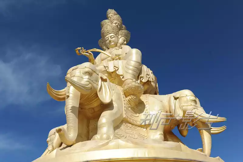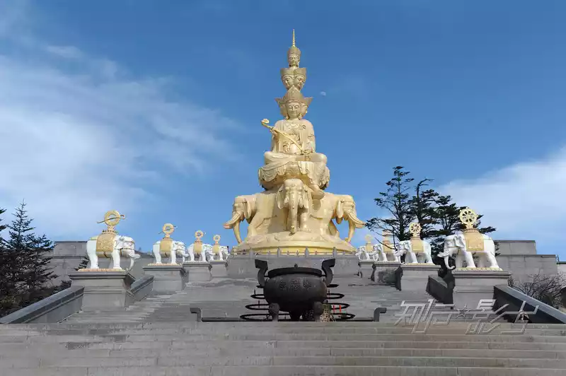14. At about 3 p.m., we arrived at the Golden Peak. The very universal Bodhisattva sits upright in the center, scorching and shining; The ten directions refer to the ten vows of the Bodhisattva: honoring the Buddhas, praising the Tathagata, making extensive offerings, repenting of karma, rejoicing in merit, please turn to fanlun, inviting the Buddha to live in the world, always following Buddhism, always obeying all sentient beings, and turning to the world, and also refers to the southeast, northwest, northeast, northwest, southeast, southwest, up, and down, and the ten avatars with different expressions represent the ten mentalities of the world. It means that the boundless vows of the universal virtuous can fulfill the Buddhas and sentient beings of the ten directions and three generations; Puxian Bodhisattva sits upright on the golden peak of Emei, blessing all good people with long-lasting, auspicious and healthy health!