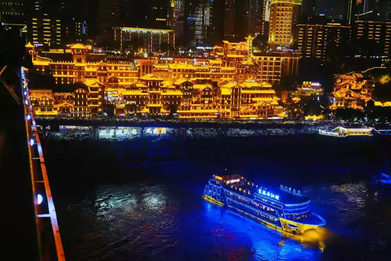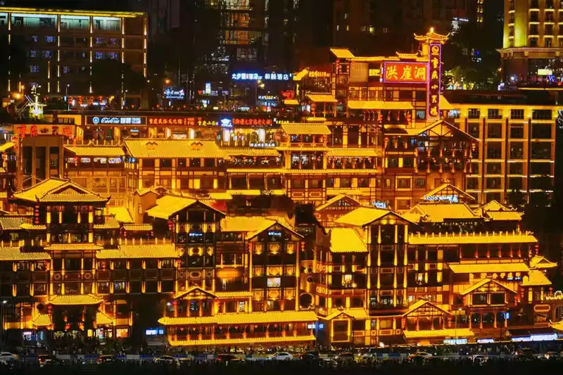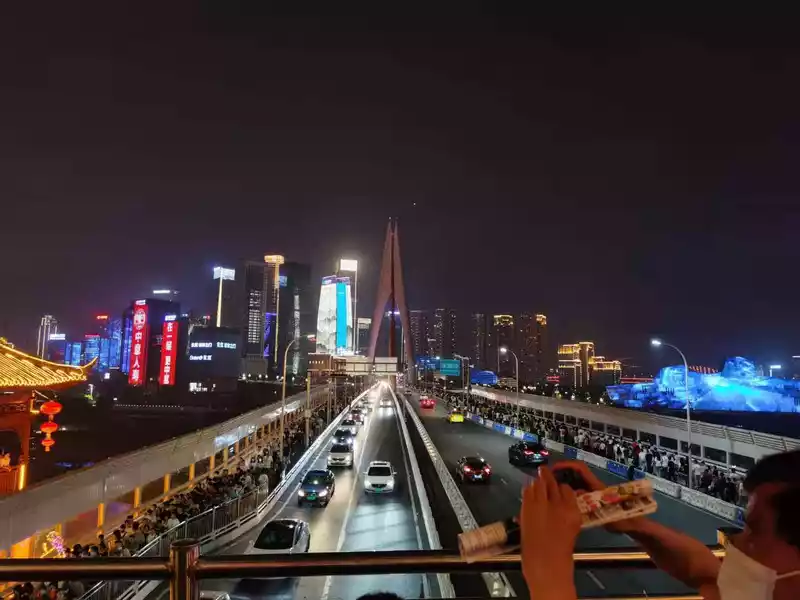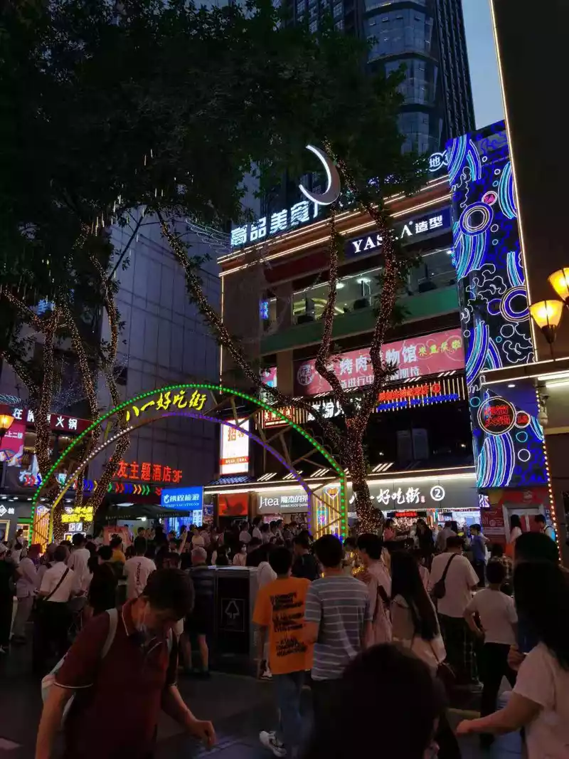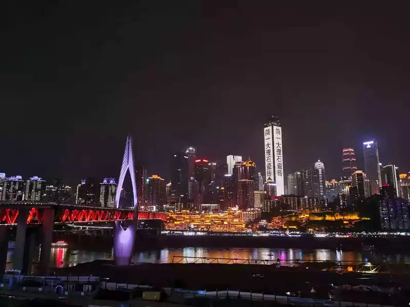 Wait until after 20 o'clock, you can finally see the night view of Hongya Cave (the online guide says that the best night view time period is 20-21 o'clock). At this time, Hongya Cave was as expected, and the real-time road conditions on the map around it were red and dirty, and there was a long queue at the entrance of the scenic spot. Fortunately, I made a strategy in advance, and went directly to the Qiansimen Bridge next to it to watch the most complete night view, and the people on the bridge were not less than the people below, but in order to control the flow of people on the bridge (I don't know if this is usually the case), the sidewalks on both sides are two-way and one-way, and the most embarrassing thing is that the half near Hongya Cave is the return side, that is to say, you need to walk to the other side of the bridge first, and then go back. Of course, in order to save energy and take the road behind, we chose to take a subway stop to the Grand Theater Station on the other side, and then walk back, witty ^^