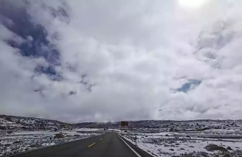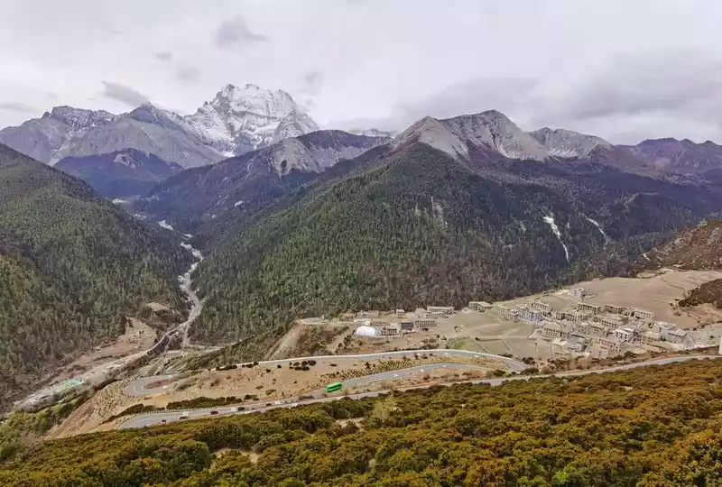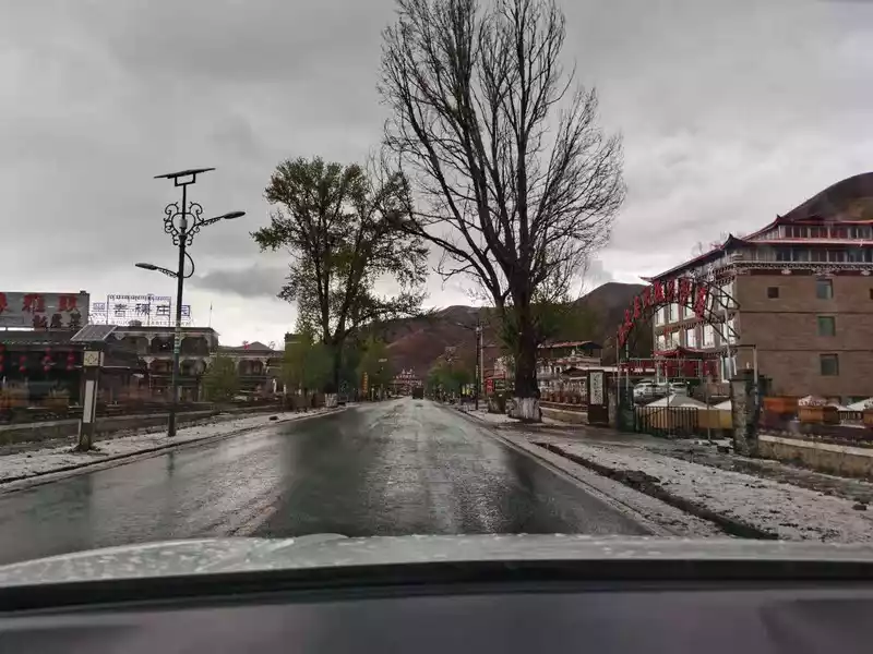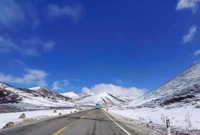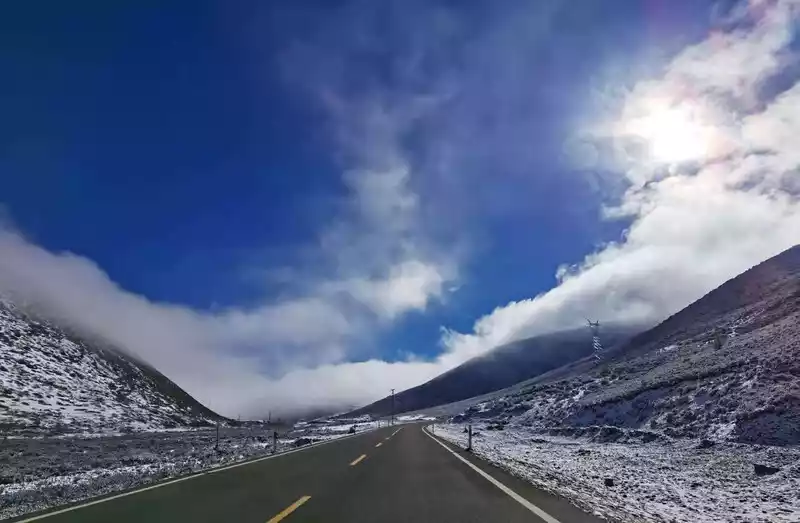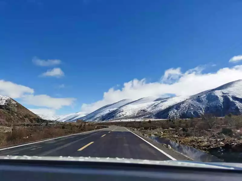 Starting the return trip today, it takes nearly 17 hours to drive directly from Daocheng and Aden back to Chongqing , and it is difficult to drive in a day, so we choose to drive to Ziyang City (about 13 hours) tonight, and you can also choose Kangding , Ya'an , Meishan or Hongya County according to your travel time.The weather is good today, not long after leaving Shangri-La Town, I saw the snow on a sunny day, presumably it should have snowed heavily last night