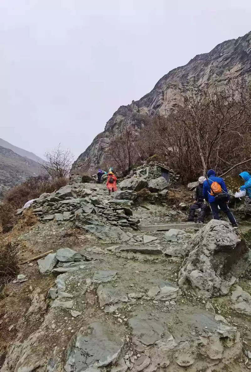 here, the horse can't sit anymore, start to climb the mountain, today's weather is cloudy and foggy, and there is a lot of hail, plus the strong wind on the top of the mountain, This highlights the importance of a thick raincoat