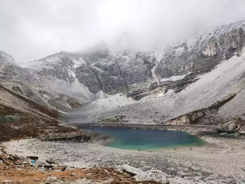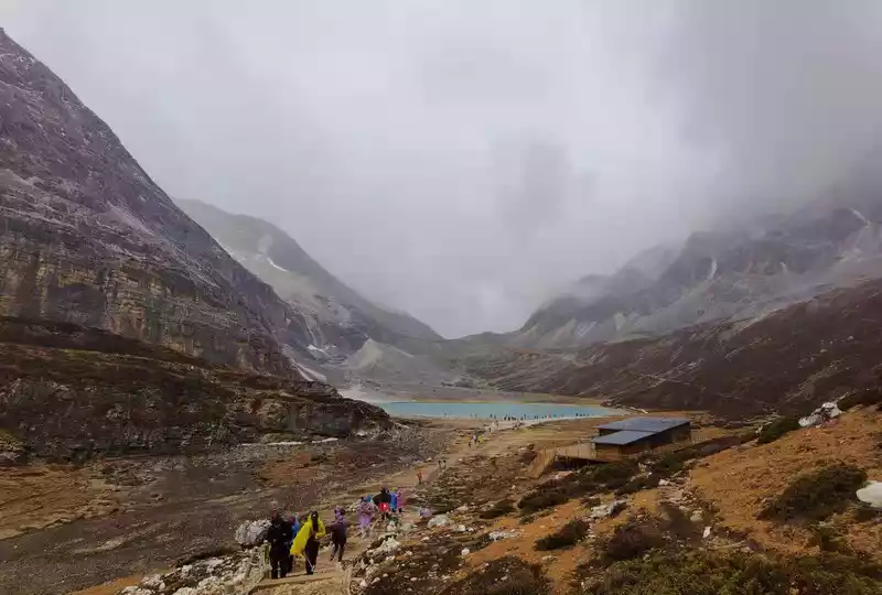 Because I plan to return tomorrow, I have to finish the day to finish the transfer, but I can only choose between the long-term and short-term lines.It is rare to come here, and decisively chose the long line (Chonggu Temple - Luorong Cattle Farm - Milk Sea - Five-Colored Sea). Get up early in the morning, bring a raincoat prepared in advance (it is recommended to buy a matte thicker one, don't buy the kind of plastic that is thin, the wind will blow away), rain boot covers (if you don't have white shoes, you can not use them), oxygen cylinders (this depends on personal situation, we basically don't use it) and Snickers (most of the guides on the Internet recommend this), plus a glass of hot water (I personally feel that raincoats, Snickers and hot water are essential). Considering that the section from the Luorong Cattle Farm to the Milk Sea and then to the Five-Colored Sea in the back can only be hiked, 5.5km one way, or a mountaineering road, so those who can take the scenic car in front of them have chosen to take the car. There are still as many people as ever at the entrance of the scenic spot during the opening hours (think about how wise it is to come after closing the door the day before ^^).