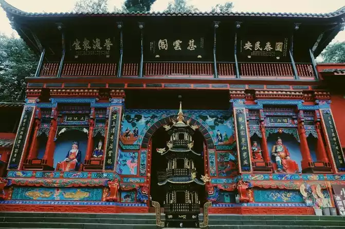 first place to arrive at after entering the scenic spot of Qingcheng Mountain is Ciyun Pavilion, and the brightly colored murals are very conspicuous.