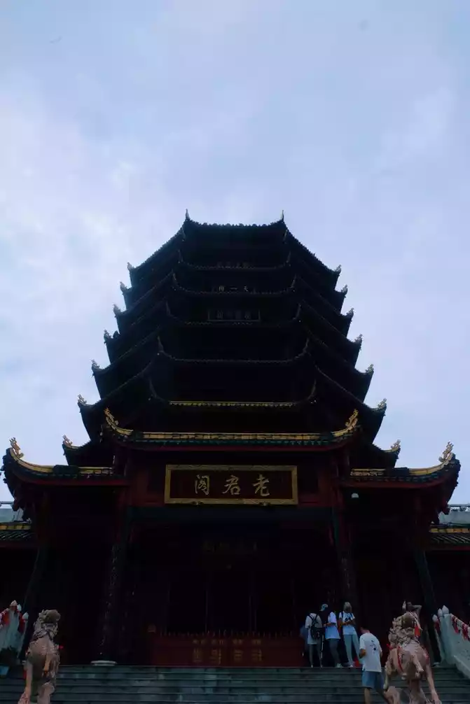 Laojun Pavilion is located at the top of the first peak of Qingcheng, with an altitude of 1,260 meters, and there is an original echo pavilion on the top, which means "climb high and call out, all the mountains respond". In the late 80s of the 20th century, the pavilion was renovated and pavilions were built. After the destruction of the "5.12" earthquake in 2008, the current reconstruction pavilion is 33 meters high, with a total of nine floors, the lower part is round, and the layer has octagonal, symbolizing the round place of heaven and Tai Chi; The appearance is tower-shaped, with a spire and a pile of three round treasures in the middle, which means that heaven, earth and man have three talents.