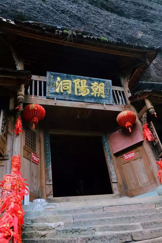 descends from the other side of Laojun Pavilion, passing through Chaoyang Cave, and the entrance of the cave faces the east. The Qing people Huang Yunge once lived here, and wrote a couplet: "The sky is far away and the red sun is near, and the earth is tired of the palace width". The modern painter Xu Beihong also wrote a couplet here: "The hollow welcomes the light, and there is a phoenix coming from the cliffs".