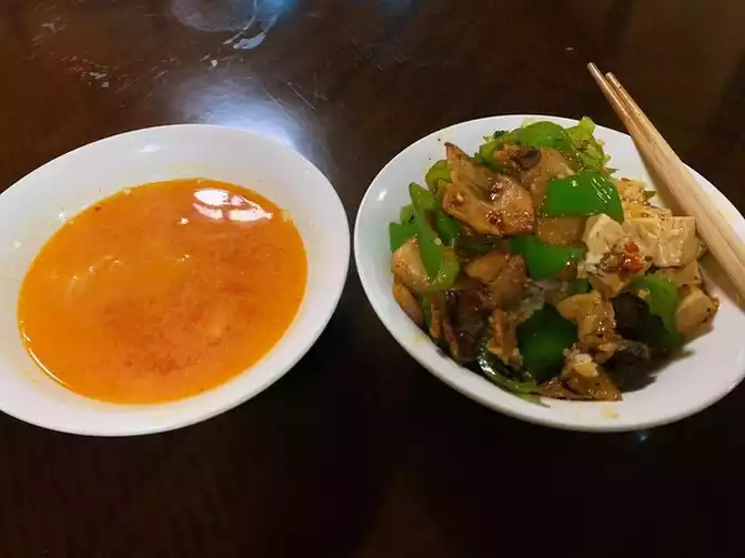 food in the Old Summer Palace is very simple but also very delicious, perhaps because it is located in Shu, and a few simple stir-fries are very delicious. And almost every meal has my favorite sweet and sour pork, as well as rice soup that I haven't drunk for a long time.