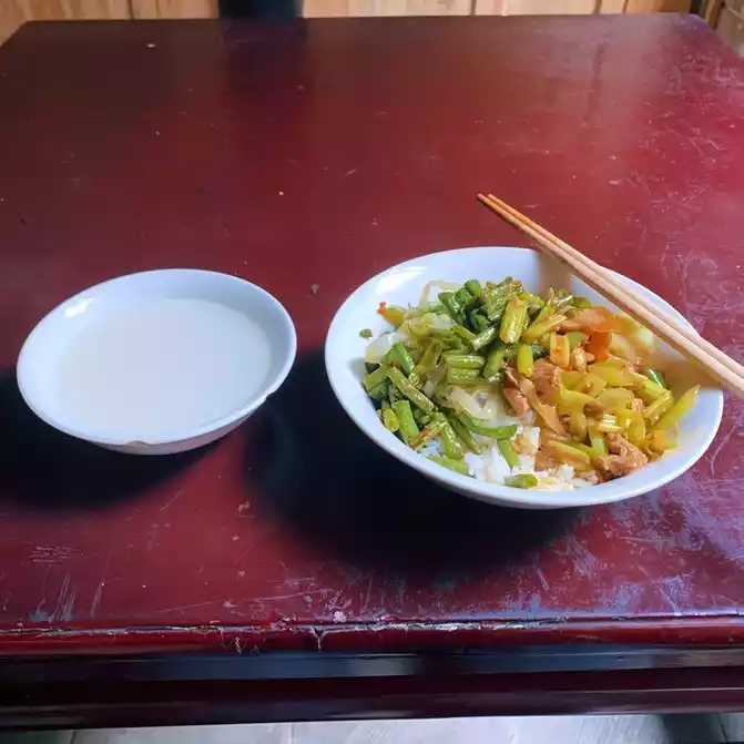 There is a small vegetable field behind the Old Summer Palace, as well as chickens, and the local eggs are particularly fragrant. But meat and other seasonings need to be transported up from the bottom of the mountain, although there is a car, but the mountain road is rugged and tire-consuming, so eating here is a bit expensive, 40 yuan a meal, in the form of a large pot of rice buffet, you can go into the kitchen and scoop it casually.