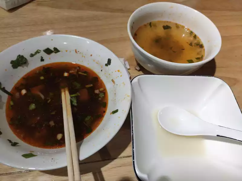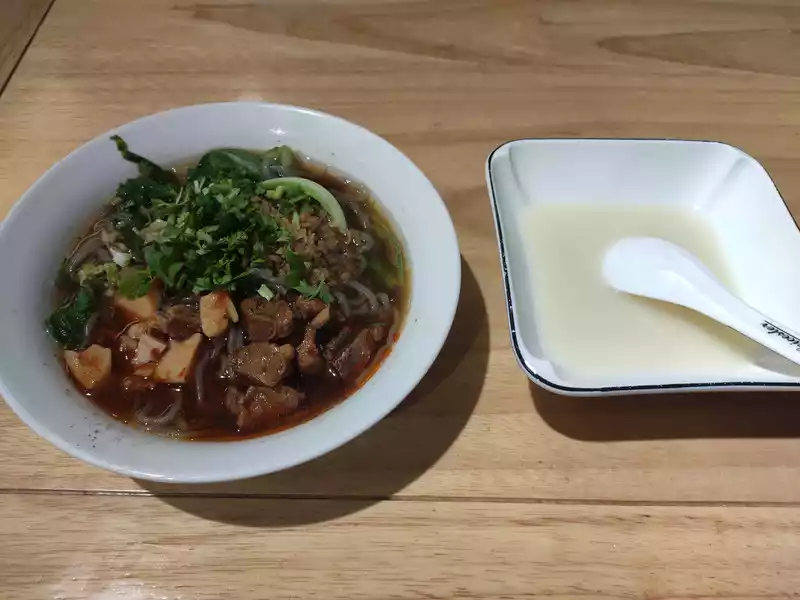 Asthe locals say, non-spicy noodles, as the literal meaning, non-spicy noodles with spicy meat.