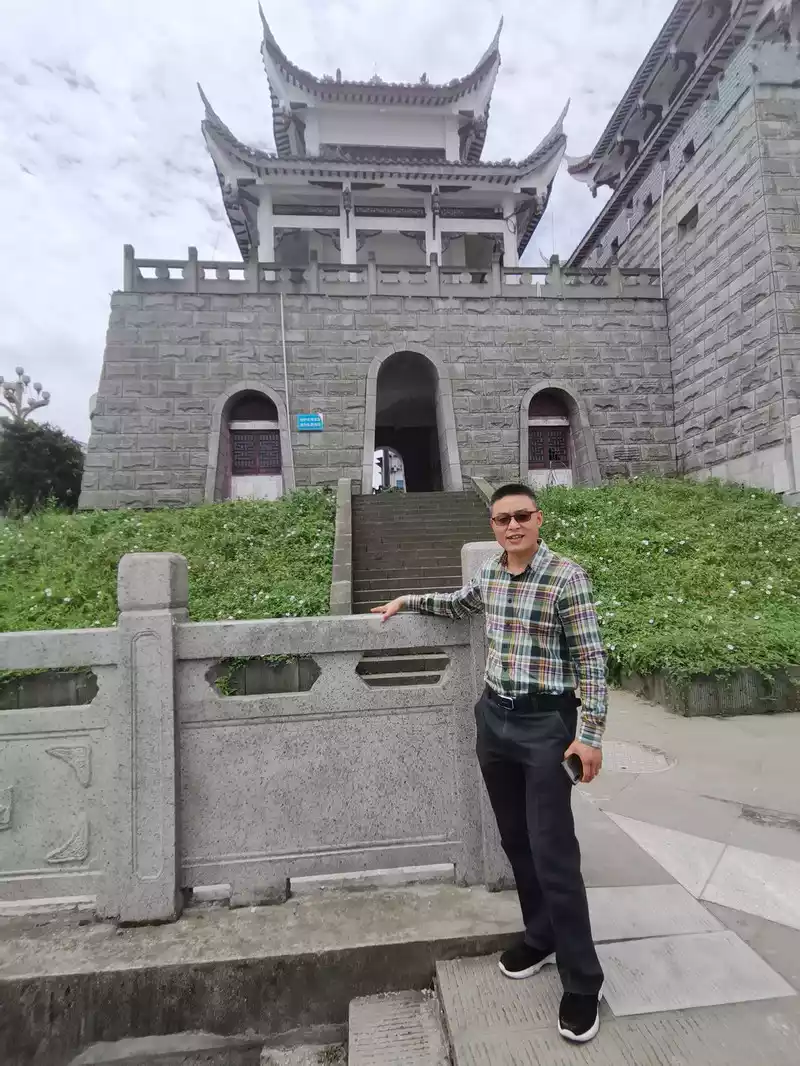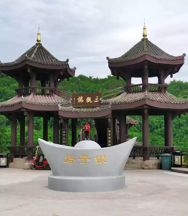 The car stopped in front of the arch gate in Qianwei County, which is a newly built antique building next to the Min River.