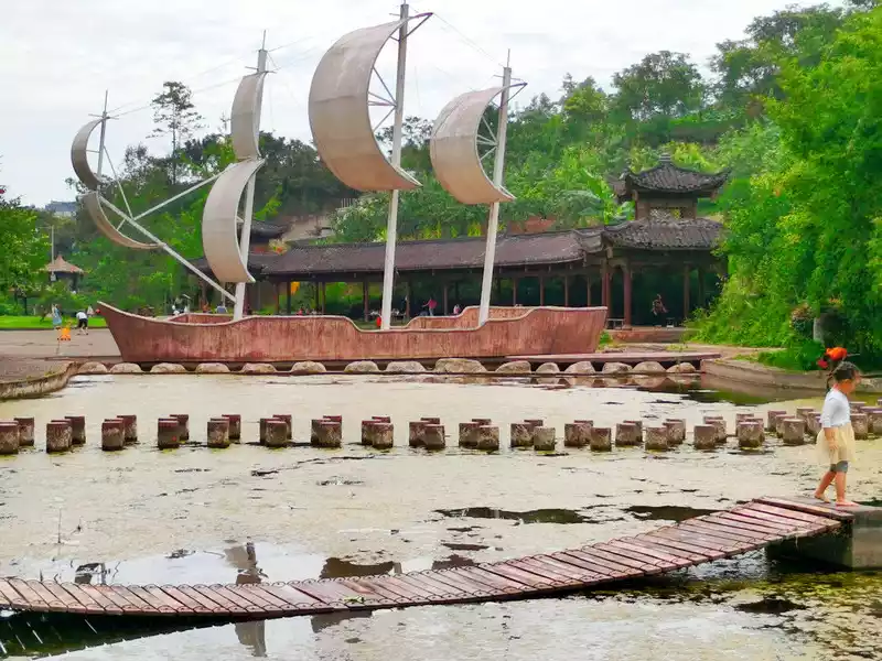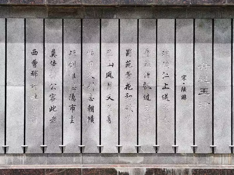 On the cultural wall on the wharf, there is a poem by Lu You of the Song Dynasty "Boat Over Yujin": "The glass river sends the remnants of spring, and the drums urge the Yujin." The orioles and flowers in the Shu Garden have just awakened from my dreams, and the scenery and moon of Bashan are once again related to me. I have long forgotten the headscarf of the court, and I only think of the dust of the city with my short sword. Don't rely on you to tolerate this old man, how can you spit out the car in the west?"According to the Internet, his words express the patriotic enthusiasm for restoring national reunification, pour out the grief and anger of unrequited ambitions, and expose and criticize the humiliating surrender of the upper ruling group of the Southern Song Dynasty.
